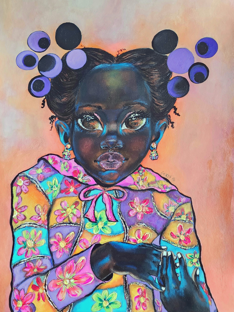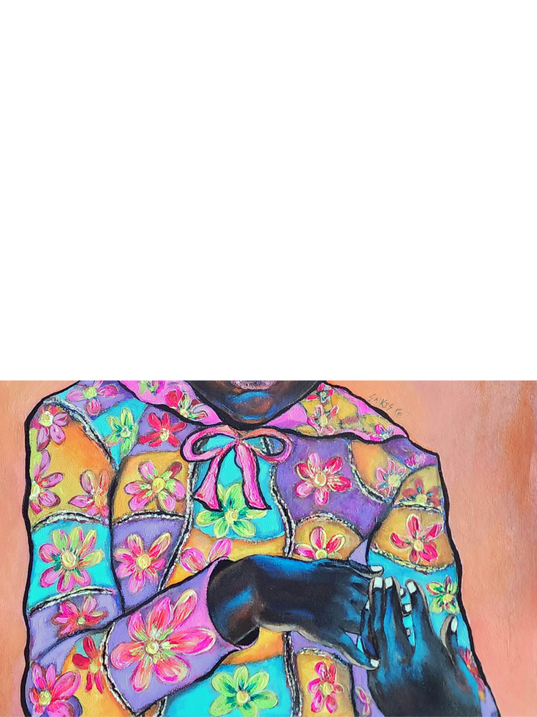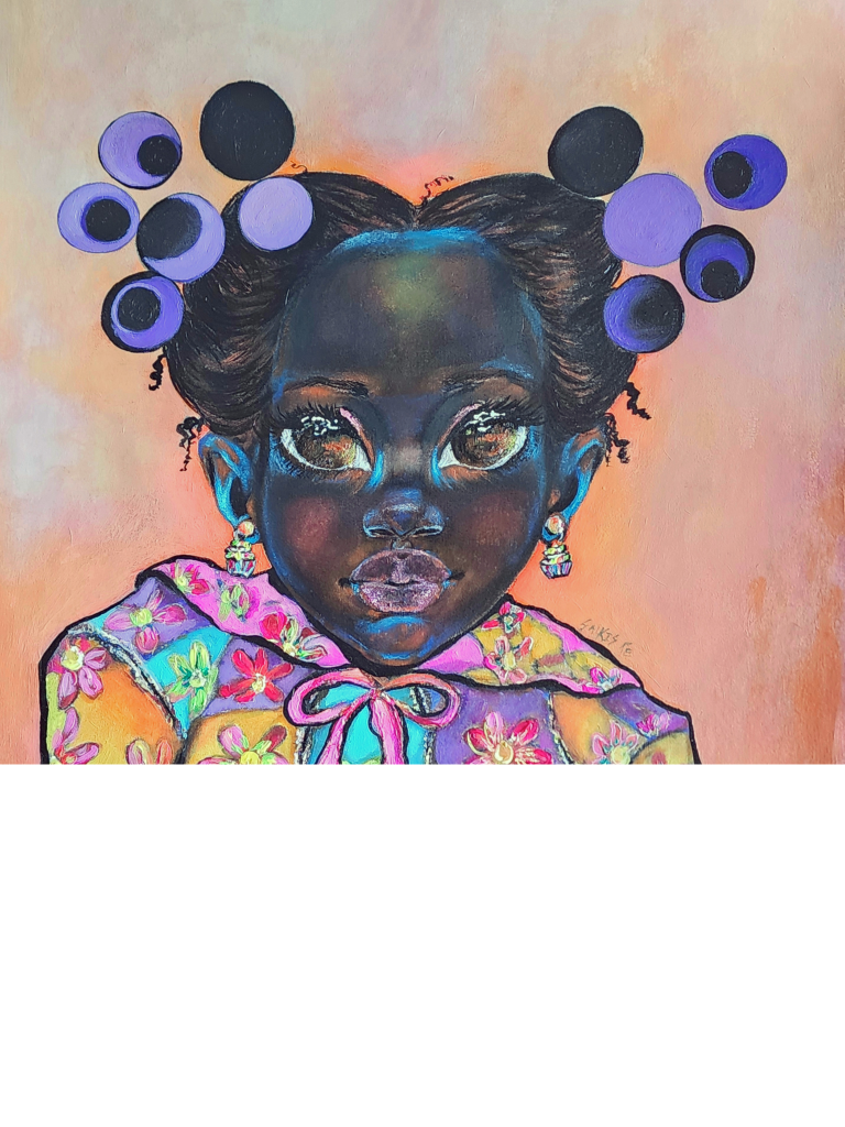 Main colors: Blue, , purple, Burt orange and pink against a pale orange and beige background..