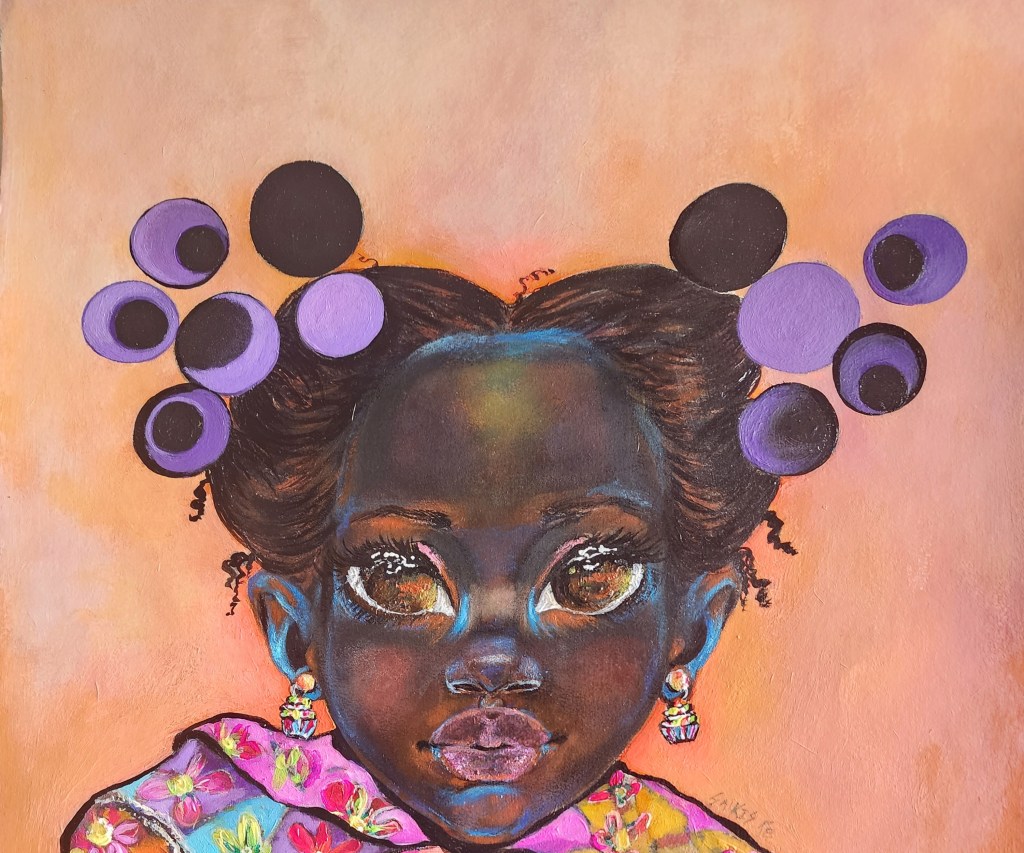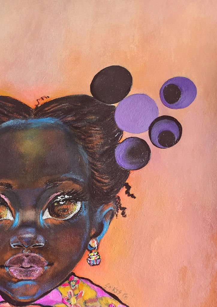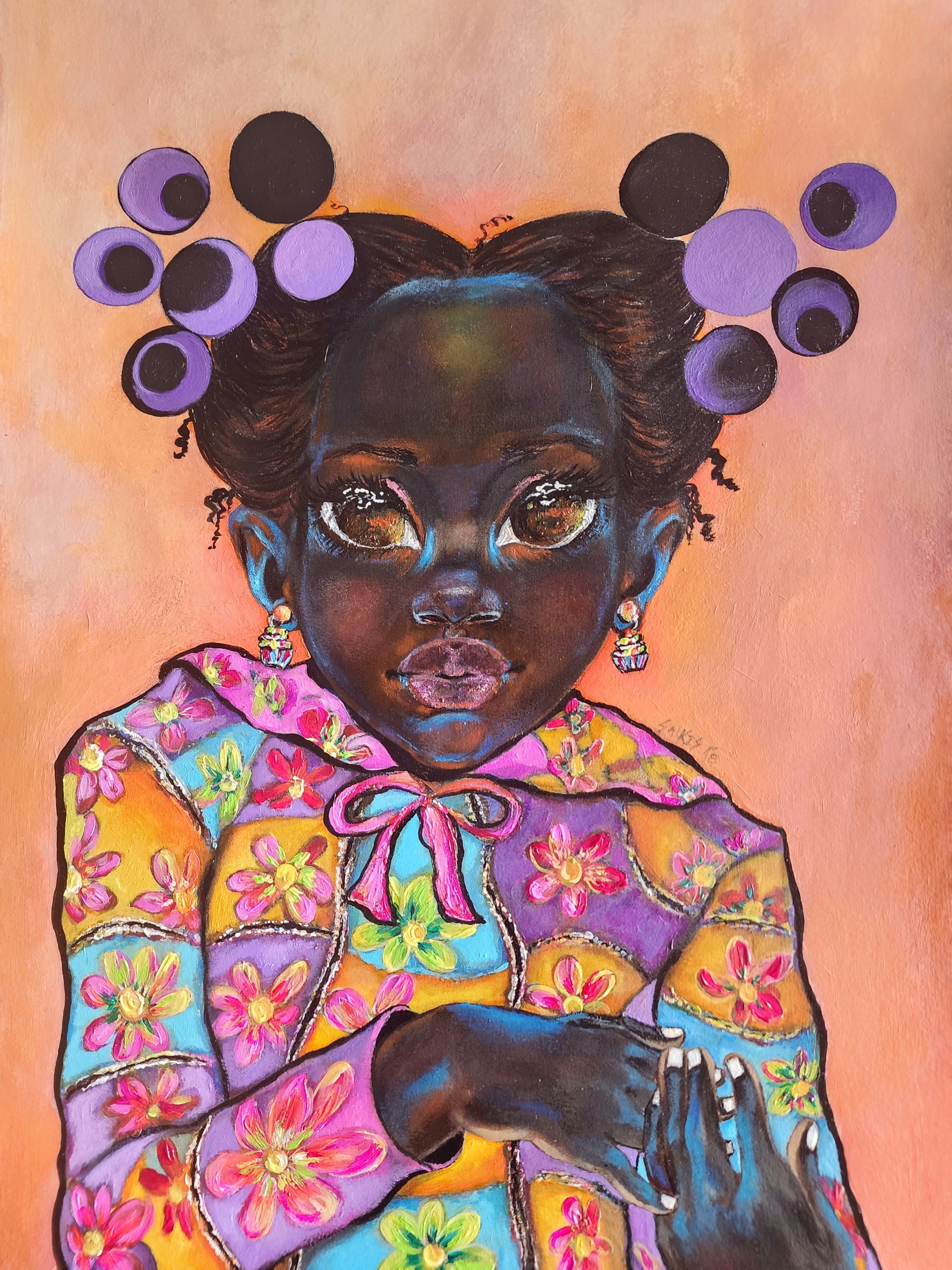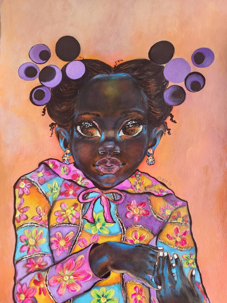 Details: This art piece just gives a 70’s vibe. From her patchwork colorful sweater to cupcake earrings, she is a girly girl to the fullest extent. Her skin is a rich dark brown with blue highlights and the her background is a soft peach tone..