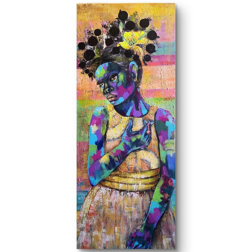 She has black skin with Grey and white highlights. The main color throughout the piece is yellow.