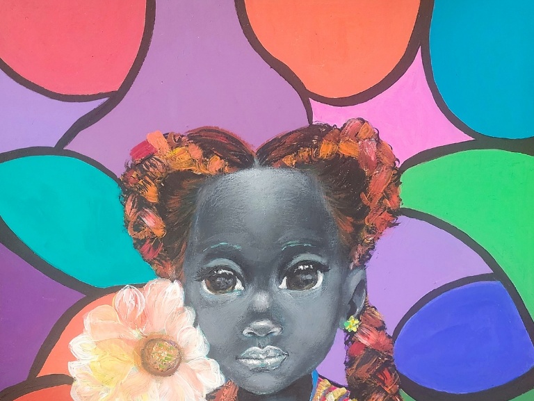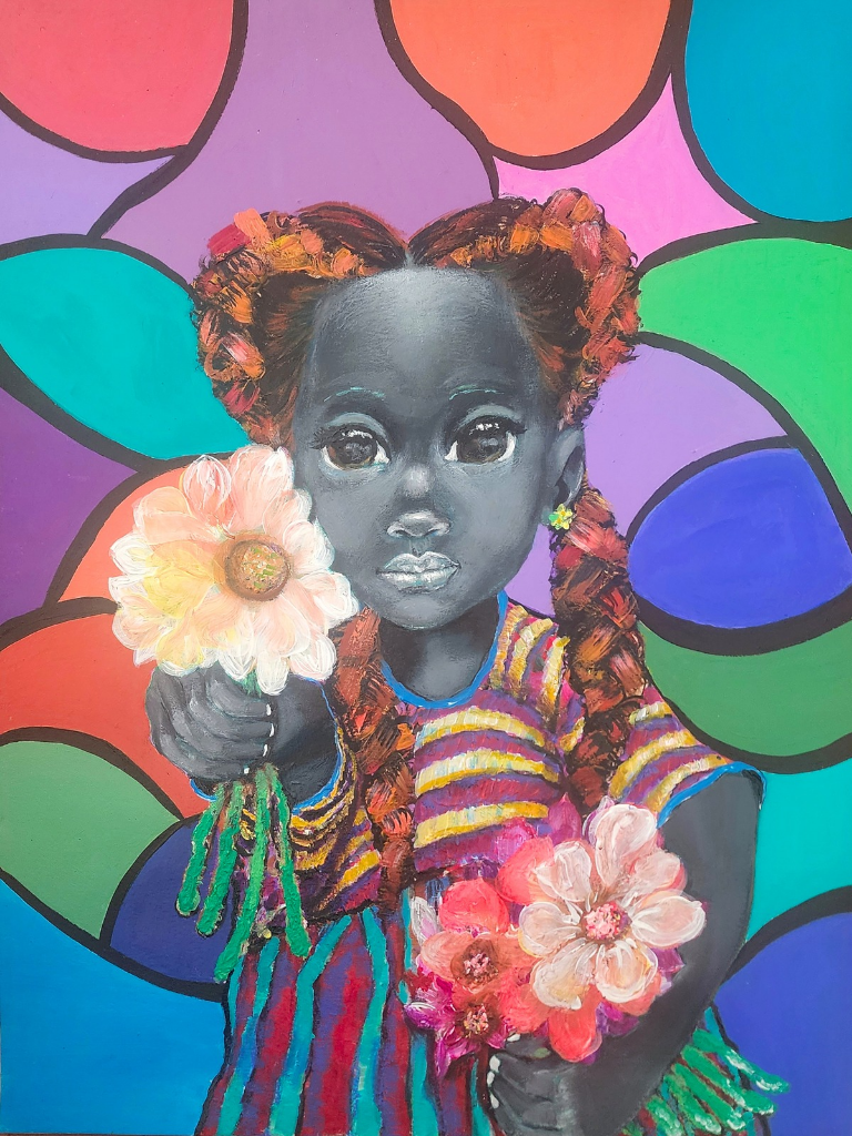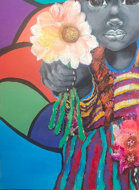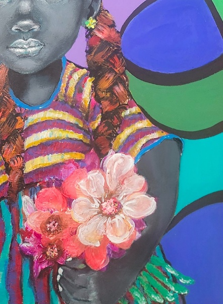 This art piece has a retro feel to it. Bold pattern background with blues, greens, purples, and orange. Flowers are white with orange accents, pinks and reds tones.