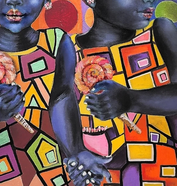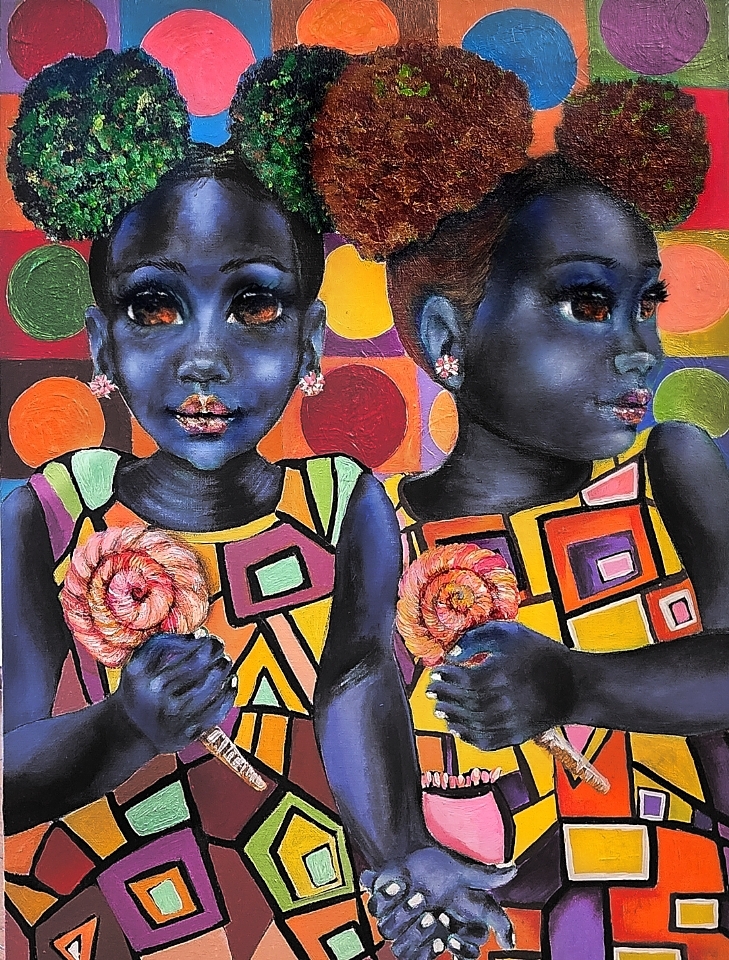 They are inspired by a 70’s esthetic. Retro bold color patterns dress the background. The focus color is the blue-green hue of their skin with complimentary colors of burnt oranges, reds, muted purples and pink throughout this art piece.