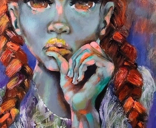 his art piece with hand embellishments is rich with sea green tones, muted purple, burnt orange, and reds.