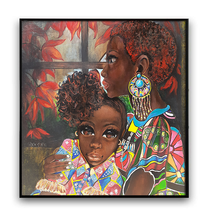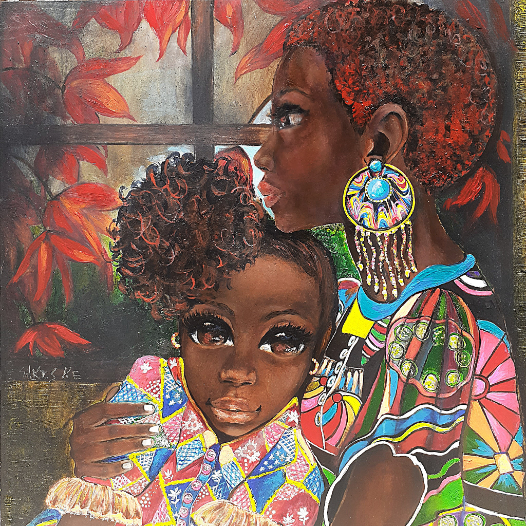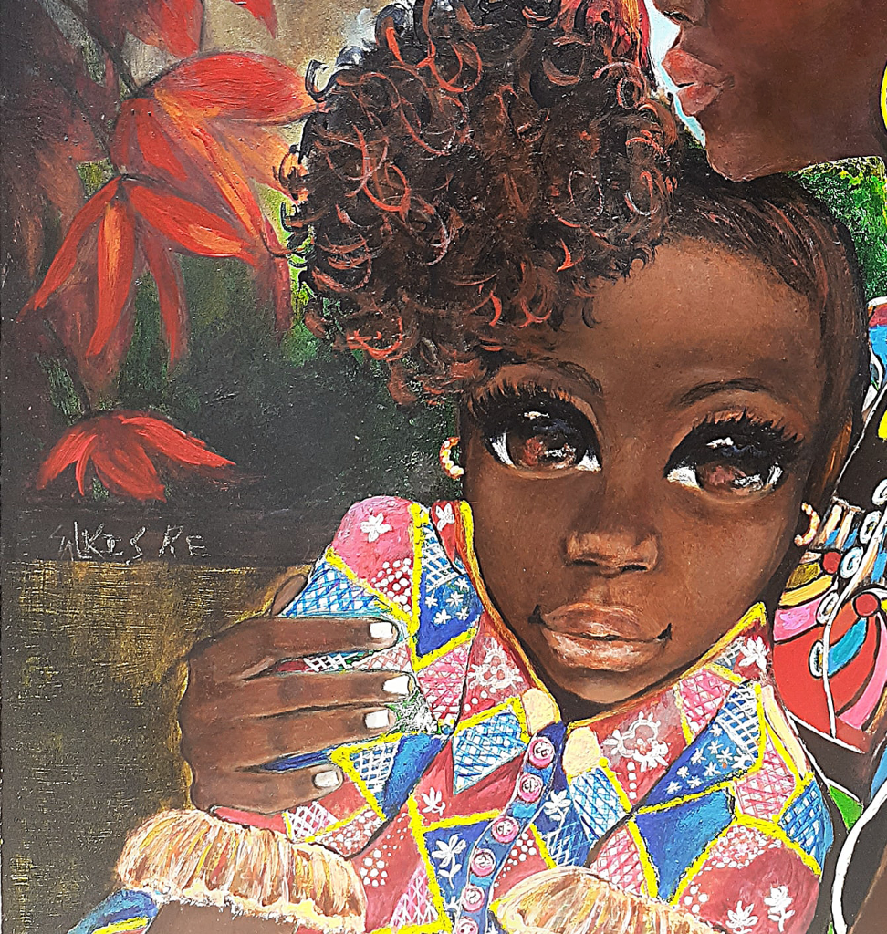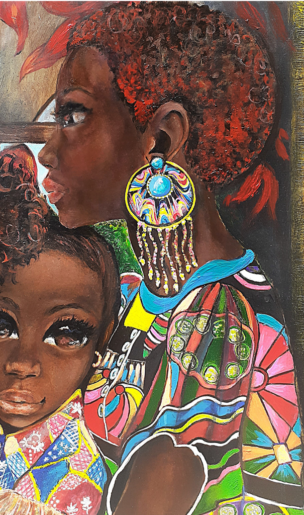 Both are dressed in vintage 70’s style clothing set by a window of a Caribbean style garden. The dominant colors are reds and blues. Both are dark skin girls with reddish hair.